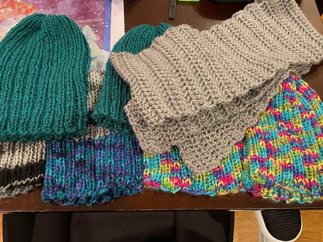I also worked some on the charity project that I’ve been working on for a bit now. I have seven hats finished up and I’m in the process of making scarves to go with the hats. The charity is hoping to have 100 hats and scarves donated by the end of October to be able to give to those who need help staying warm. We have been asked to put them in a ziploc bag so that they will stay dry if outside and to include a note in each bag to encourage the recipients. I’m almost finished with the second scarf now, so just five more to go. This has been a great stash buster project and I am grateful for that!