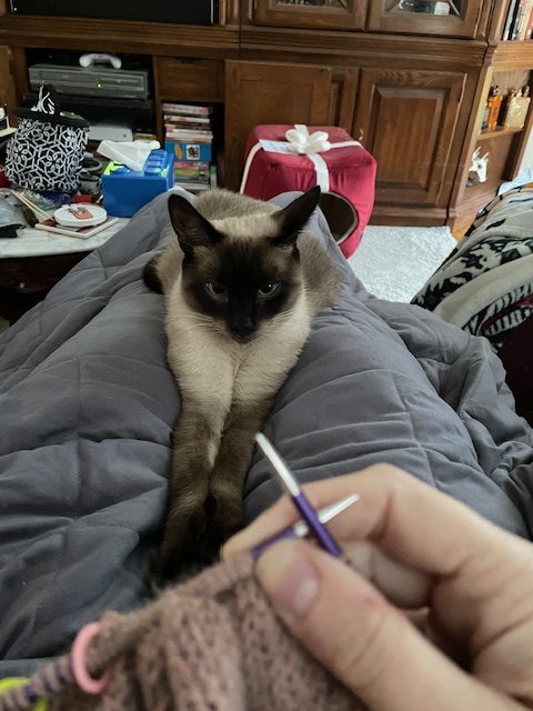 Some days, the disease wins. Some days, I can tame down the beast with tricks and distractions. Yesterday was a combination of both. You can see from the picture above that I was pulling out several tricks for this one. I put on a very heavy weighted blanket, pulled out the knitting, and had a cat join me for the afternoon. That didn’t work for this one. I got about two rows done, then ended up taking the weighted blanket with me to the bedroom and lay down and curled up. After about three hours, I started coming down from the waves of anxiety.
