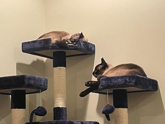 This is the green version of the purple that I spun a month or so ago. I’m hoping to combine them somehow when it is all spun up to create something nice. I just need to see how much yardage I get out of the roving before deciding what to make. We also have had much more activity on the cat tree recently, so I thought I would share the two meezers hanging out together.