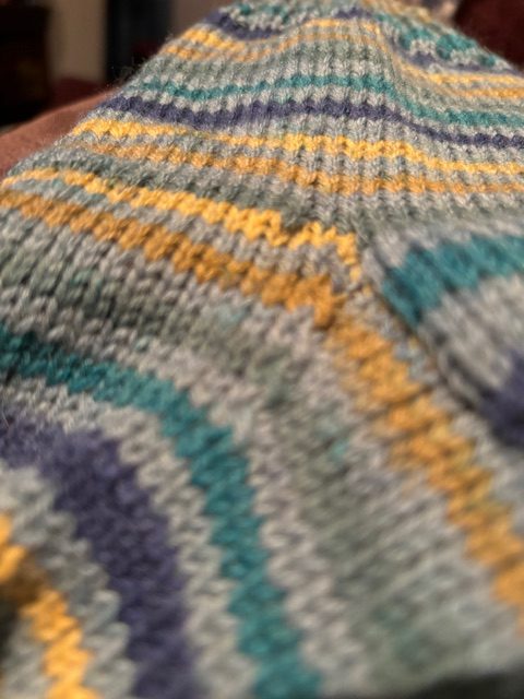 Unfortunately this picture looks a little bit odd because of the angle, but you get the basic idea of the colors. It’s once again Kroy Sock which is my go-to sock yarn. This one goes to a much smaller foot than the other ones I have been making, so that may also be why it looks kind of odd to me considering I have ski feet!